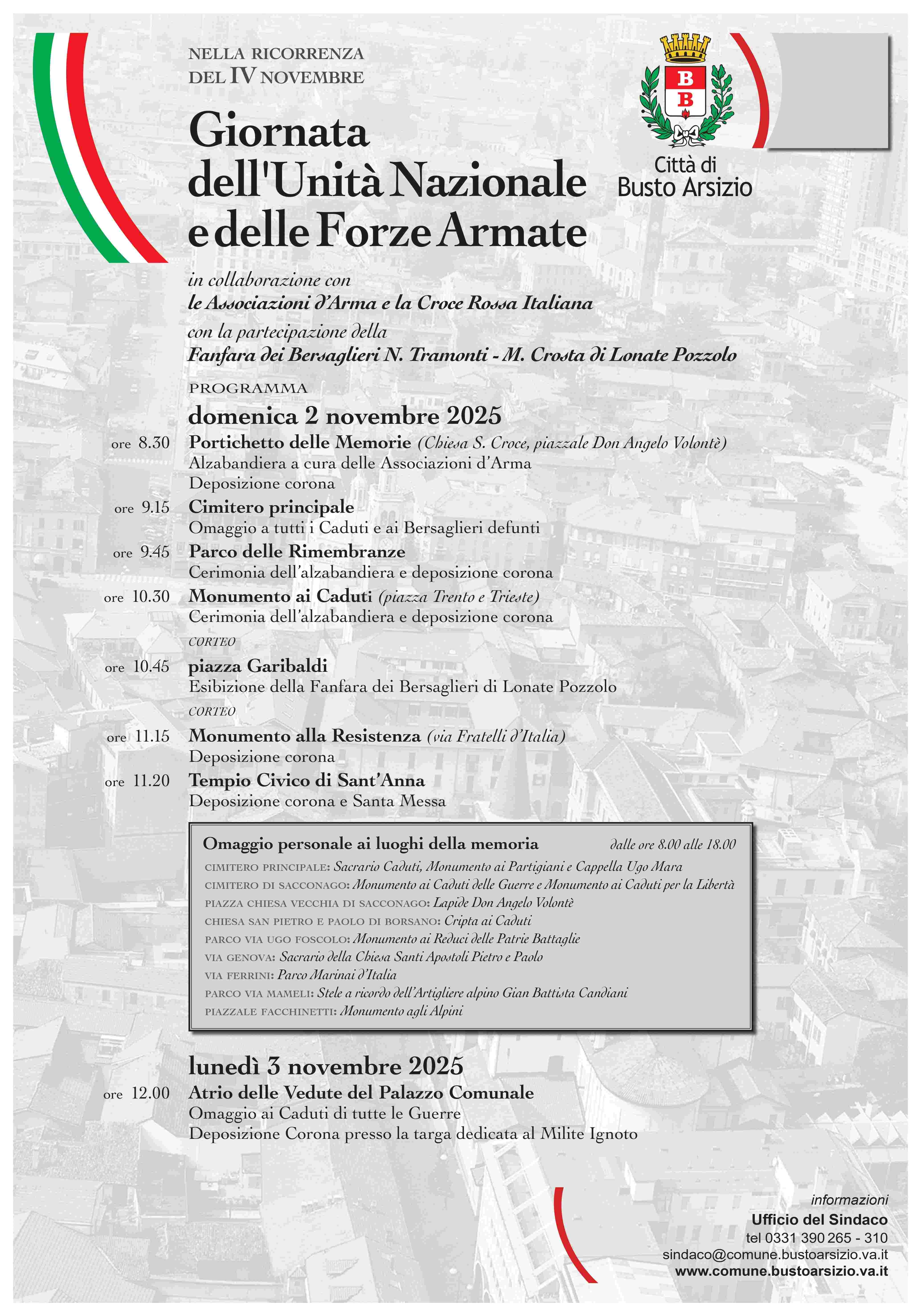 • alle ore 12.00 presso l’Atrio delle Vedute del Palazzo Comunale si svolgerà l’omaggio ai Caduti di tutte le guerre e la deposizione della corona presso la targa dedicata al Milite Ignoto.