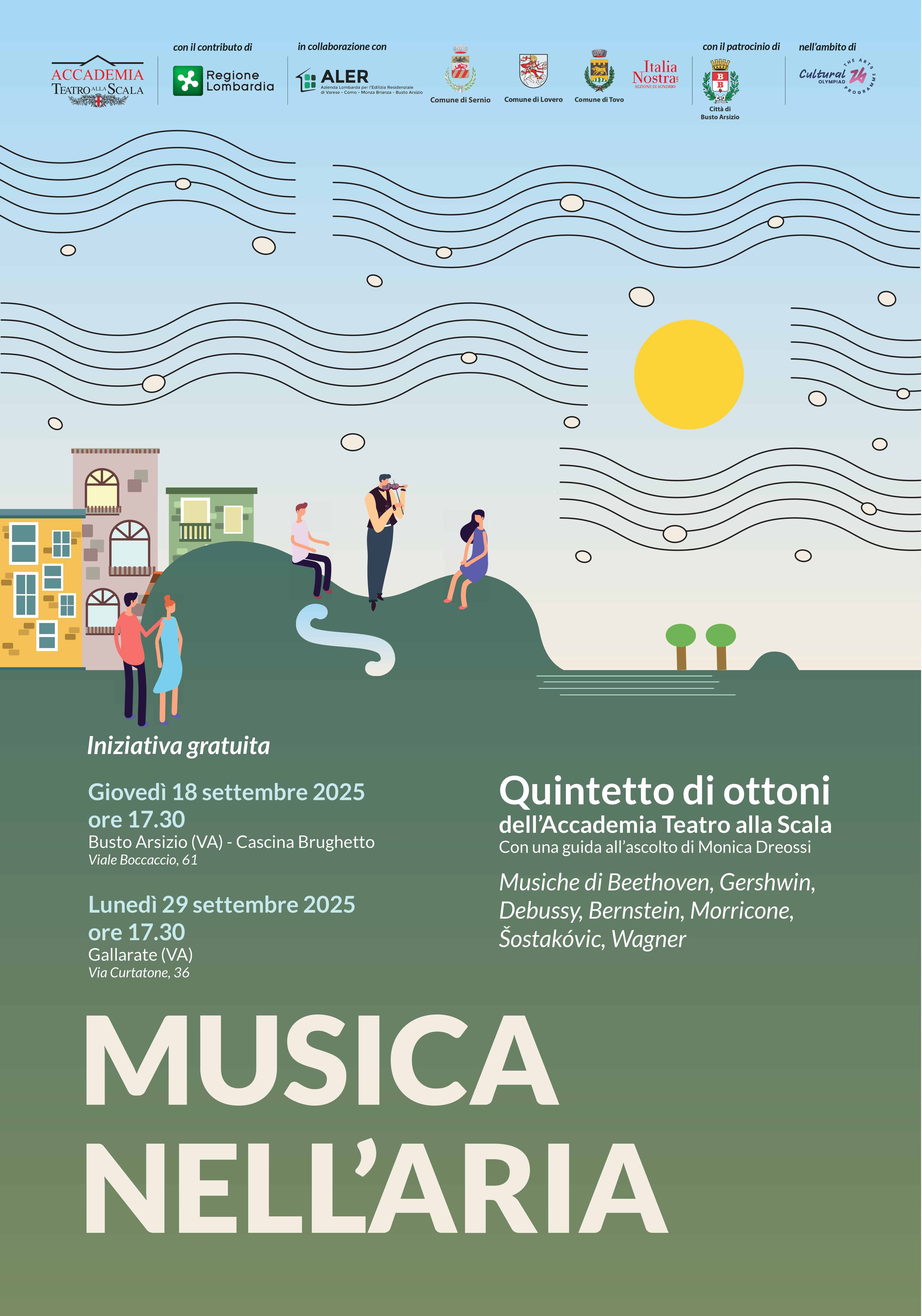 Dopo il successo dei due appuntamenti in Valtellina, il 18 e 29 settembre torna Musica nell’aria, il progetto di Accademia Teatro alla Scala, realizzato con il sostegno di Regione Lombardia - Direzione Cultura, in collaborazione con Aler Varese, Como, Monza Brianza, Busto Arsizio, Consorzio Turistico Media Valtellina e Italia Nostra Aps Sezione di Sondrio, che porta la musica al di fuori dei tradizionali contesti teatrali, per incontrare il pubblico in spazi urbani o paesaggistici.