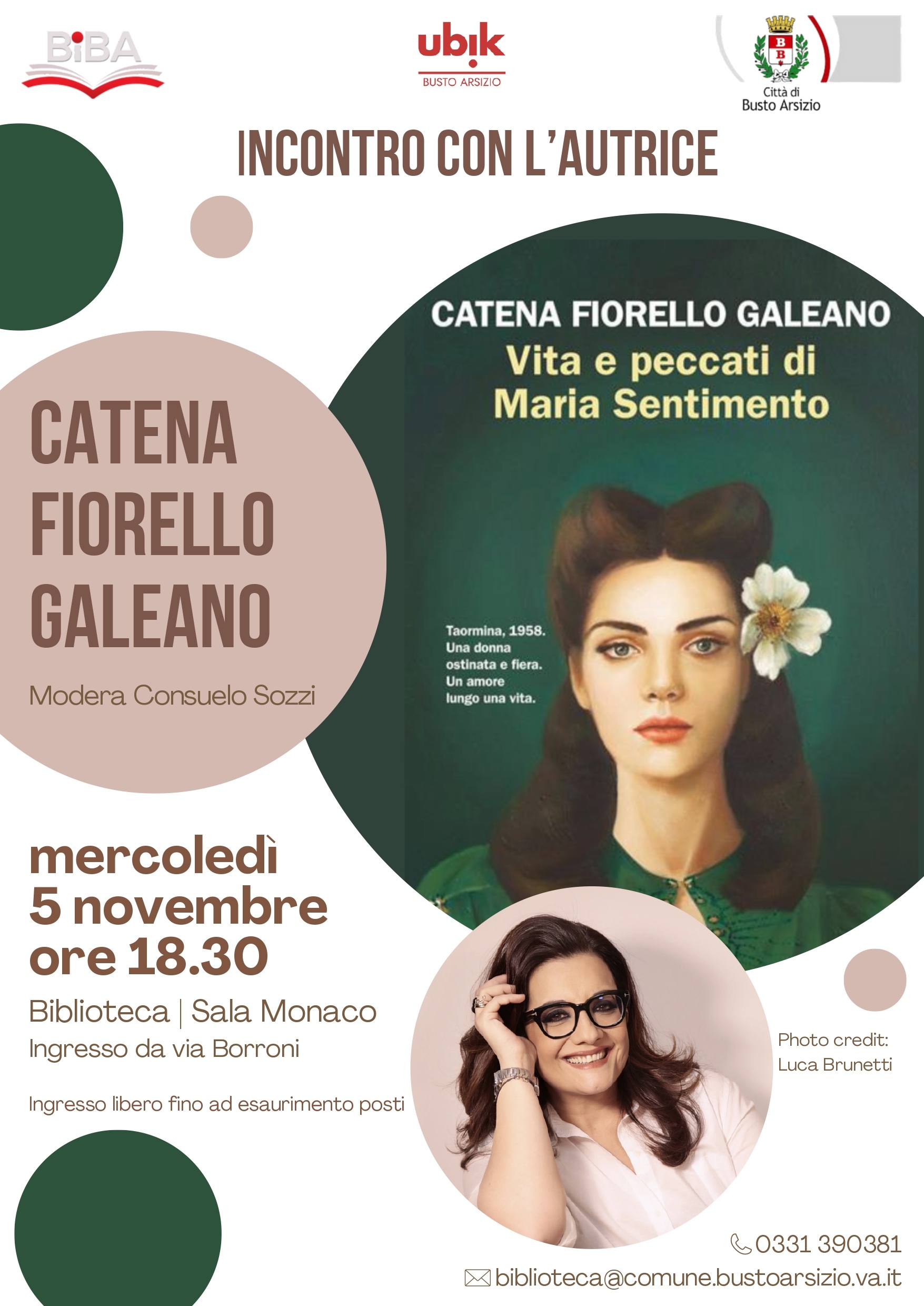 - mercoledì 5 novembre, alle ore 18.30, la Sala Monaco della Biblioteca ospiterà Catena Fiorello Galeano, scrittrice e autrice televisiva, che parlerà del suo nuovo romanzo Vita e peccati di Maria Sentimento.